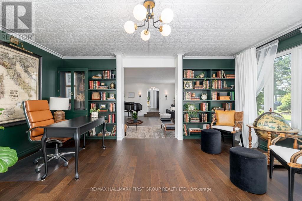 -Open-concept living, library with custom bookcases, and gourmet kitchen with wood-burning fireplace.